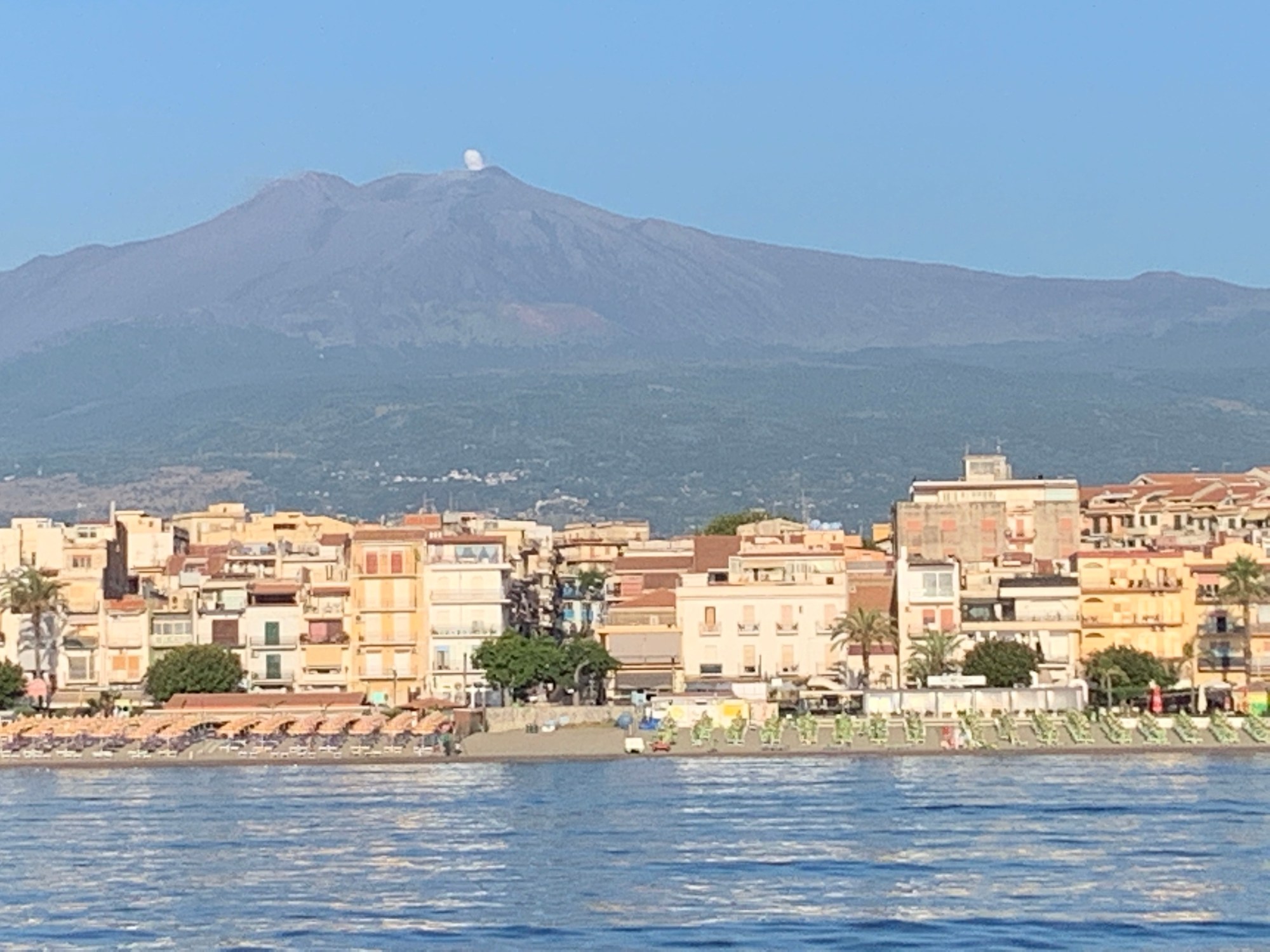 Über die alte Route geht es wieder südlich, erst über Crotone, dann nach Roccella. Auf dem Törn konnten wir glatt 10,5 Stunden super Segeln! Klappte ja nicht immer. Hier bleiben wir zwei Nächte. Wir müssen Waschen, Boot putzen, und vor Allem den halben Meter Pizza genießen. Weiter geht es nun nach Sizilien. Der Wind meint es weiter gut mit uns, und zu Freude Aller sehen wir mehrmals Delfine🤗. Wir laufen am Nachmittag in die Bucht von Taormina ein, mit Blick auf den Ätna, der kleine weiße Wölkchen macht. Leider tobt hier das Chaos: Kreuzfahrtschiff, Jetskis ohne Ende und hunderte kleiner Boote. Zudem steht starker Schwell in die Bucht. Das vermiest uns die Nacht und macht das Ganze doch sehr unangenehm. Eigentlich wollten wir weiter runter bis Siracusa, der Rückweg würde aber nicht spaßig, immer gegenan. Da wir hier Fluchtgedanken haben, geht es nach einem Kurzen, sehr heißem Landgang Anker auf. Richtung Straße von Messina kämpfen wir gegen heftigen Seegang und Wind, macht nicht wirklich Spaß. Jetzt sind wir erst recht froh, nicht weiter südlich gesegelt zu sein. Auf Höhe Reggio geben wir für heute auf und laufen in die Marina ein. Selbst das Anlegen ist nicht spaßig, aber mit tatkräftiger Hilfe der Marineros klappt das auch bei seitlichem Starkwind.